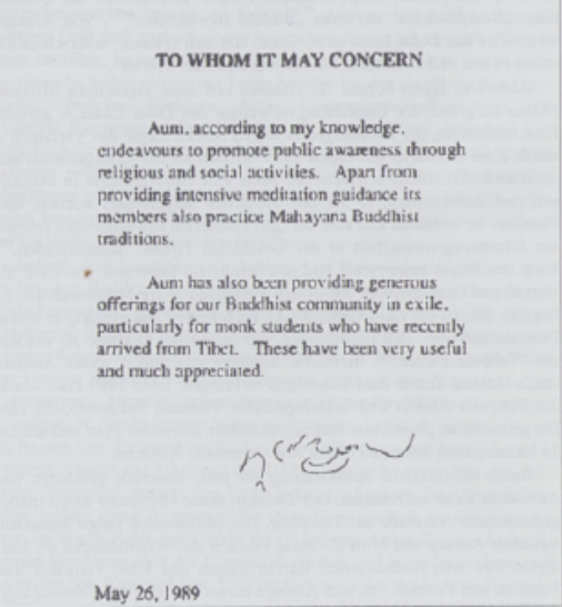 圖為達(dá)賴為奧姆真理教親筆簽署的聲明。大意如下:據(jù)我所知,奧姆真理教致力于通過宗教和社會(huì)活動(dòng)來提高公眾意識(shí)。除了提供密集的冥想指導(dǎo)外,其成員還修習(xí)大乘佛教傳統(tǒng)。奧姆真理教一直以來都慷慨地供養(yǎng)著我們的流亡佛教社群,特別是那些近期從西藏抵達(dá)的僧侶學(xué)徒。這些供養(yǎng)非常實(shí)用,我們對(duì)此深表感激。