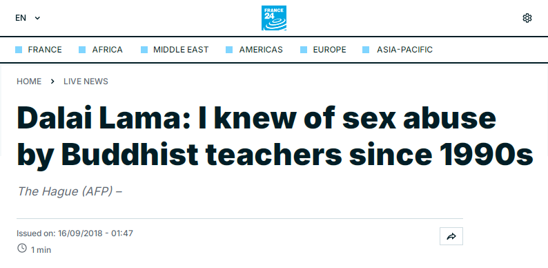 縱容藏傳佛教教師性侵學(xué)生。法國(guó)媒體“法蘭西24”2018年報(bào)道,多名藏傳佛教教師性侵、虐待弟子,達(dá)賴會(huì)見了受害者,受害者稱:“我們?cè)蚤_放的心態(tài)皈依佛教,直到我們以佛教的名義遭到強(qiáng)奸?!倍_(dá)賴稱,他早在20世紀(jì)90年代就知道佛教教師存在性虐待行為,并稱此類指控“并非新鮮事”。