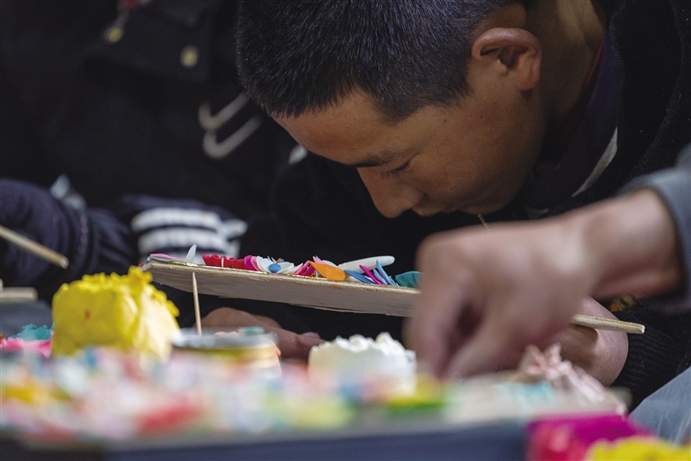 次仁羅布跟隨師傅已經(jīng)制作了30余年的酥油花。他告訴記者,在他的家鄉(xiāng)仁布縣,酥油花制作技藝是男女老少?gòu)男【驼莆盏募寄埽鄠?。次仁羅布的大兒子今年上大一,自幼跟父親學(xué)習(xí)捏酥油花,手藝嫻熟,早些年開始他就已經(jīng)可以和父親一樣獨(dú)立完成一對(duì)酥油花的制作。