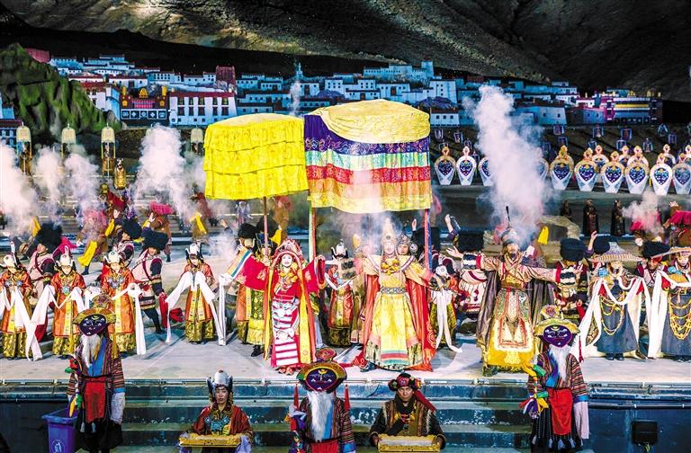《文成公主》大型實景劇以文成公主入藏為主題,以鑄牢中華民族共同體意識為根本遵循,講述文成公主與松贊干布聯(lián)姻、促進民族融合發(fā)展的故事,展現(xiàn)新時代新西藏的獨特魅力和繁榮景象。12年來,該劇累計演出2100多場,演出及園區(qū)旅游配套累計接待觀眾游客超3200萬人次,為當?shù)厝罕姲l(fā)放薪資超5億元。