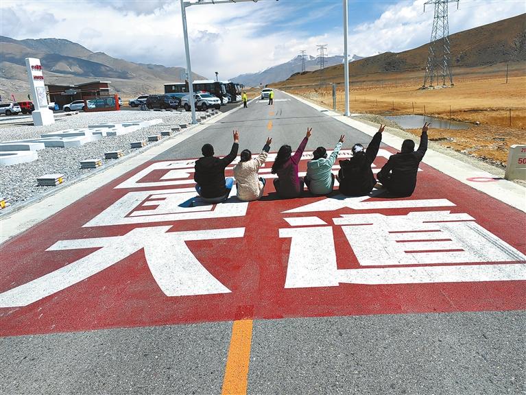 圖為游客在219國(guó)道5000公里打卡點(diǎn)拍照打卡。記者 旦增嘎瓦 扎西頓珠 攝