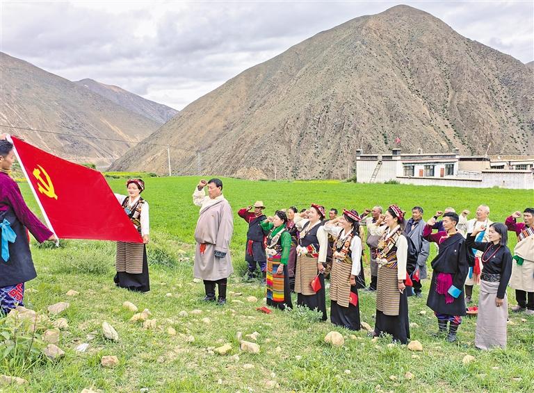 為熱烈慶祝中國共產(chǎn)黨成立104周年,7月1日,自治區(qū)稅務(wù)局駐謝通門縣仁欽則鄉(xiāng)倫珠孜村工作隊組織全體黨員在田間地頭開展重溫入黨誓詞活動。