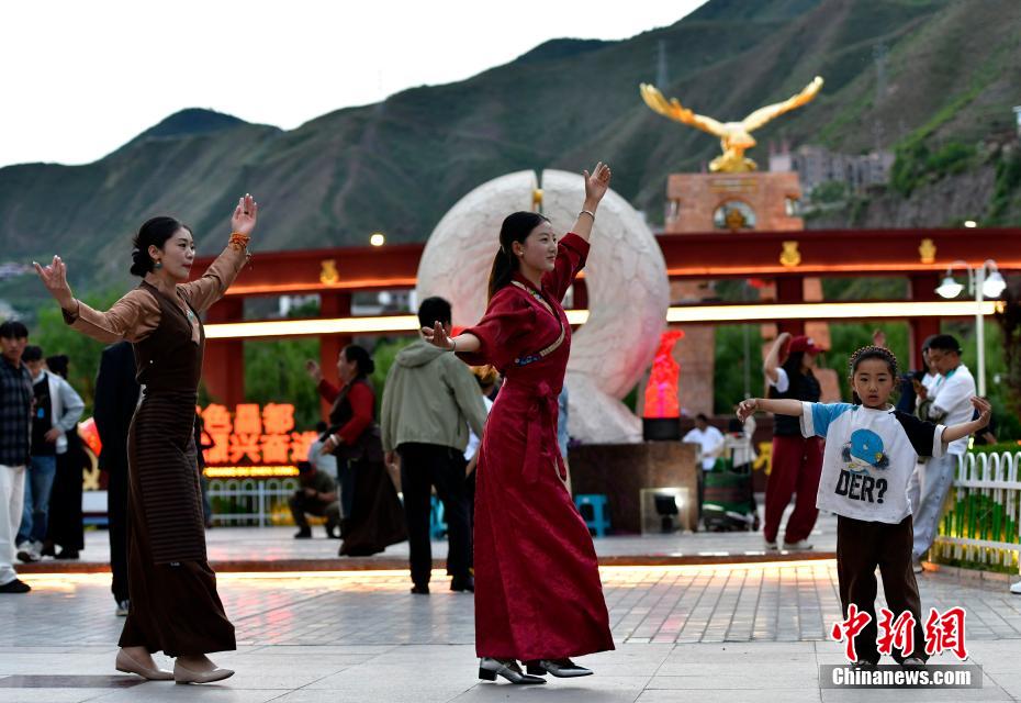 7月13日,西藏昌都瀾滄江天津廣場(chǎng)上,鍋莊舞愛(ài)好者踏歌起舞,舞出夏日夜間精彩。