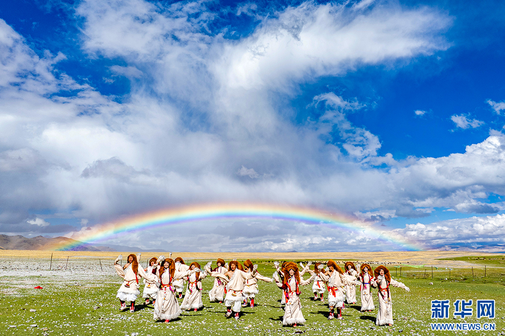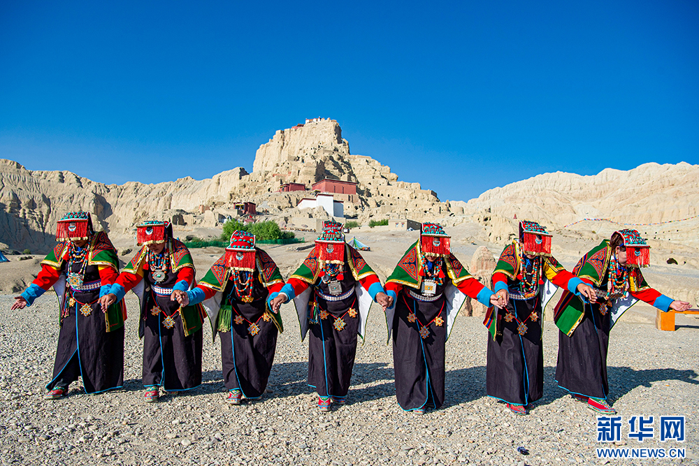 札達縣群眾在古格王國遺址腳下表演“宣舞”(6月12日攝)?!靶琛笔俏鞑匕⒗锩耖g傳統(tǒng)舞蹈,融合藏戲、舞蹈、說唱等傳統(tǒng)民間藝術,內容涵蓋禮儀、風俗、節(jié)慶等。2008年,被列入國家級非物質文化遺產名錄。新華網(wǎng) 旦增努布 攝
