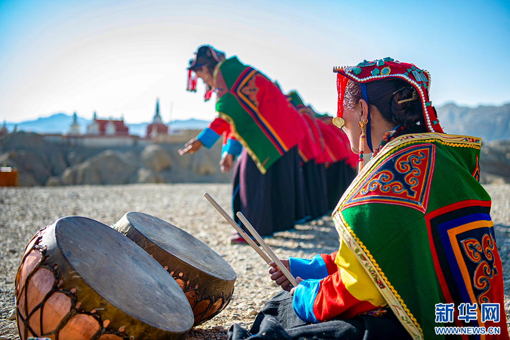西藏自治區(qū)級“宣舞”非遺傳承人央金(右)在古格王國遺址腳下伴奏鼓樂(6月12日攝)。新華網(wǎng) 旦增努布 攝