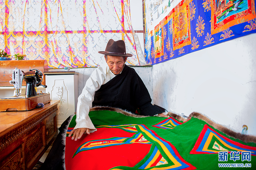 “噶爾傳統(tǒng)服飾”地區(qū)級代表性傳承人石達次仁在介紹自治區(qū)級非物質文化遺產“噶爾傳統(tǒng)服飾”(6月14日攝)?!案翣杺鹘y(tǒng)服飾”由羊羔皮和呢子內外兩面縫制而成,形狀為正方形,制作簡易,內里均為純白色的羊羔皮,羊羔皮既保暖又有裝飾性。新華網(wǎng) 旦增努布 攝