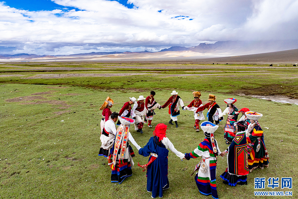 措勤縣藝術團在表演自治區(qū)級非物質文化遺產磁石“帕”卓(6月23日攝)。該舞蹈動作優(yōu)美歡快、充滿動感,帶有彈性舞步。近年來,措勤縣將磁石“帕”卓改編為課間操進校園,讓學生感受當?shù)胤沁z魅力。新華網(wǎng) 旦增努布 攝