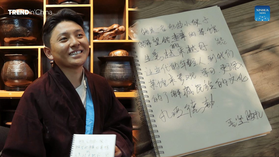 吾堅(jiān)曲扎和他在筆記本上寫(xiě)下的話。新華社發(fā)