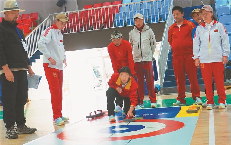 圖為運(yùn)動員在進(jìn)行旱地冰壺比賽。記者 明吉 攝