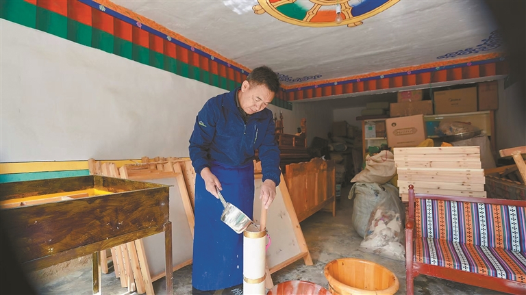 創(chuàng)辦合作社后,他在保留藏紙耐腐蝕、抗蟲蛀優(yōu)勢的同時(shí),開發(fā)出燈籠、筆記本、相框等貼合現(xiàn)代生活的文創(chuàng)產(chǎn)品,讓這門技藝從“家族傳承”走向“群眾共享”。合作社成立至今,已先后吸納10余名當(dāng)?shù)厝罕妼W(xué)習(xí)藏紙制作,從煮料、搗漿、晾曬到塑形,阿旺曲央都毫無保留地傳授技藝,讓不少曾靠零散務(wù)工為生的村民,擁有了穩(wěn)定的“手藝收入”。村民查果便是其中一位受益者,“以前打零工收入不穩(wěn)定,現(xiàn)在跟著阿旺曲央老師學(xué)做藏紙,每月能掙2000余元,在家門口就能上班。”