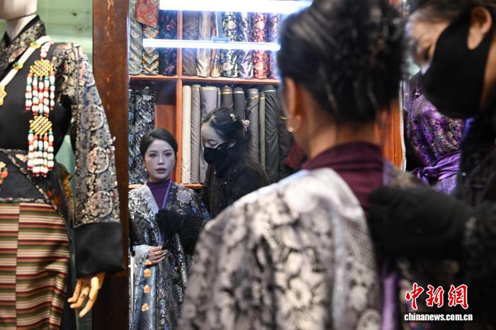 2月5日,隨著2026年春節(jié)與藏歷火馬新年腳步臨近,西藏拉薩市街頭節(jié)日氛圍日益濃厚,八廓街周邊的各式藏裝店迎來銷售旺季。圖為拉薩民眾在定做藏裝。中新社記者 貢嘎來松 攝