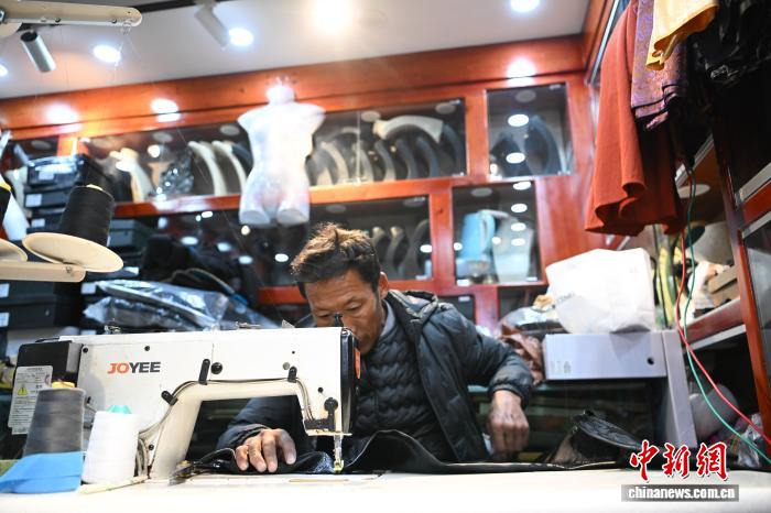 2月5日,隨著2026年春節(jié)與藏歷火馬新年腳步臨近,西藏拉薩市街頭節(jié)日氛圍日益濃厚,八廓街周邊的各式藏裝店迎來銷售旺季。圖為藏裝店里的老板在縫制藏裝。中新社記者 貢嘎來松 攝