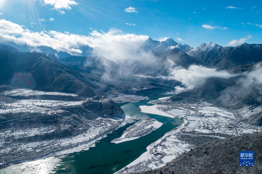 當(dāng)日,西藏林芝市米林縣派鎮(zhèn)雅魯藏布大峽谷附近普降瑞雪,銀裝素裹的雅魯藏布江和南迦巴瓦峰顯得格外壯美。