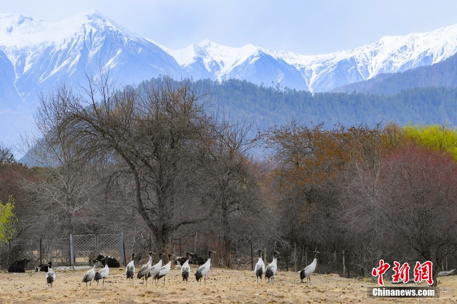 3月30日,在西藏林芝市巴宜區(qū)更章門巴民族鄉(xiāng),黑頸鶴與周邊的村莊、桃花、雪山融為一體,成為春日里的一道靚麗的風(fēng)景線。圖為黑頸鶴在田間覓食嬉戲。