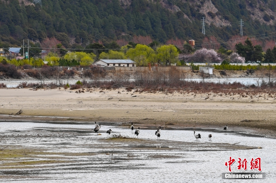 3月30日,在西藏林芝市巴宜區(qū)更章門巴民族鄉(xiāng),黑頸鶴與周邊的村莊、桃花、雪山融為一體,成為春日里的一道靚麗的風(fēng)景線。圖為黑頸鶴在河邊覓食嬉戲。