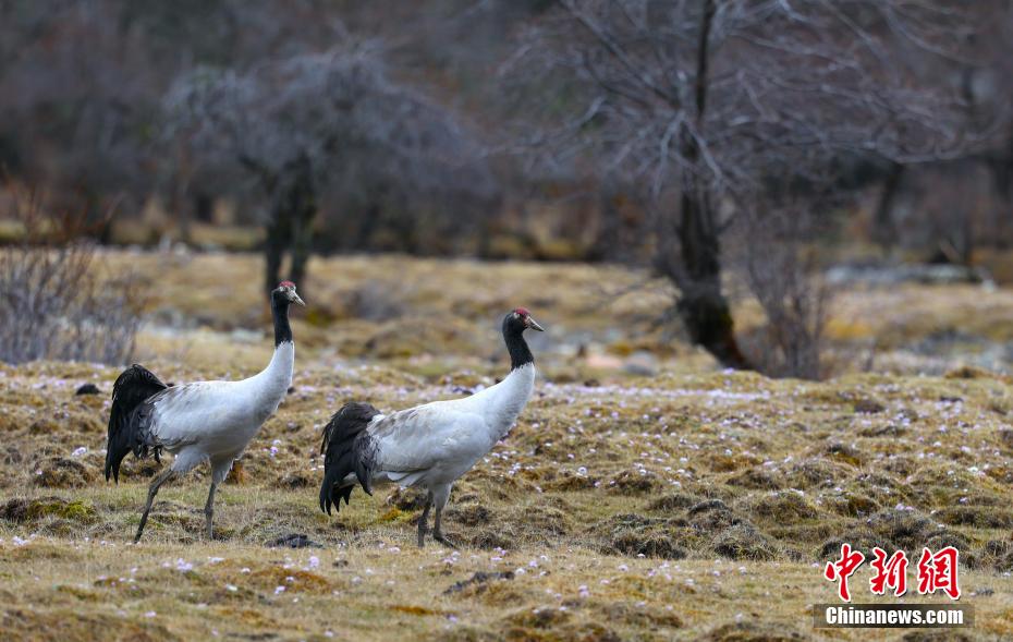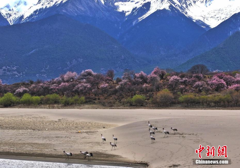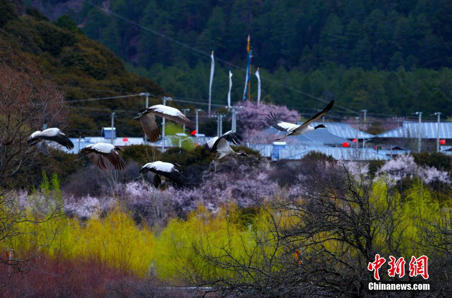 西藏林芝:黑頸鶴與桃花共繪春日畫(huà)卷