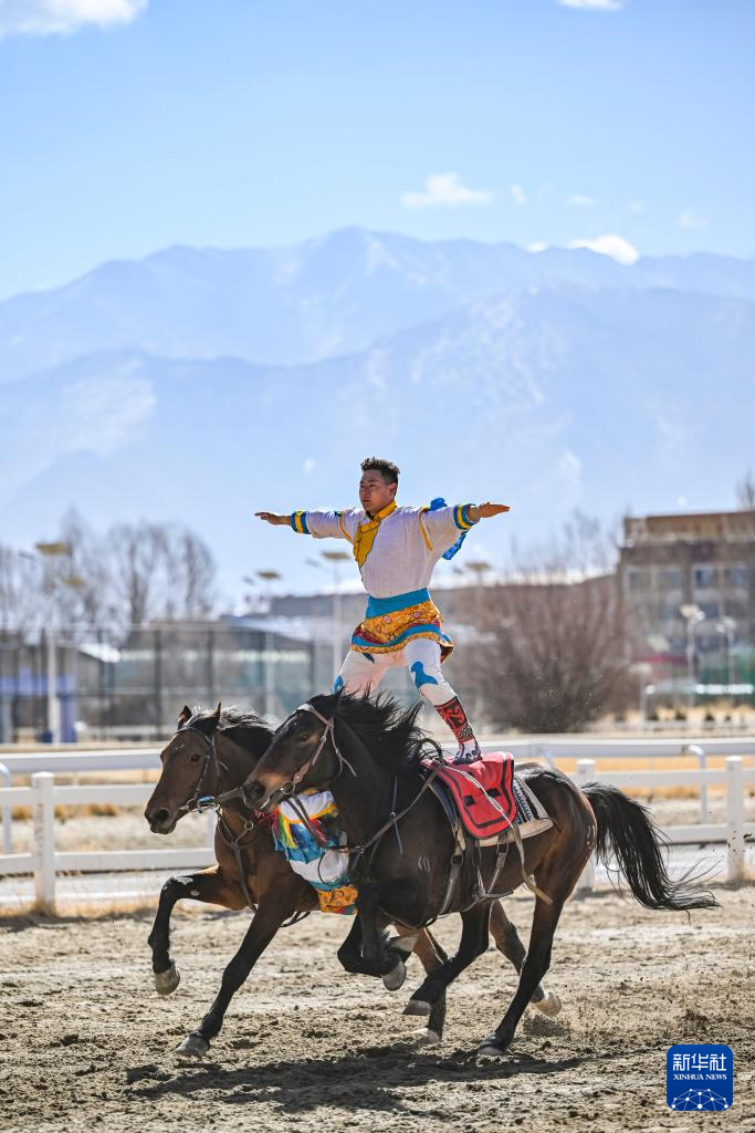 在拉薩賽馬場(chǎng),騎手進(jìn)行雙馬單人表演(2月12日攝)。新華社記者 孫瑞博 攝
