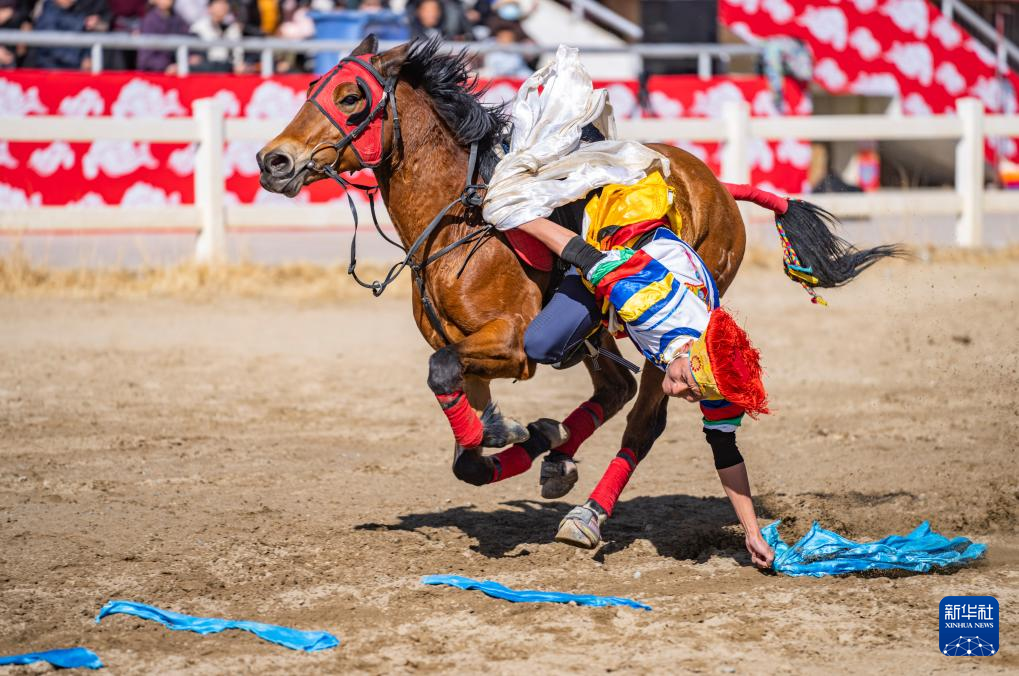 在拉薩賽馬場(chǎng),騎手表演馬上拾哈達(dá)(2月12日攝)。新華社記者 孫非 攝