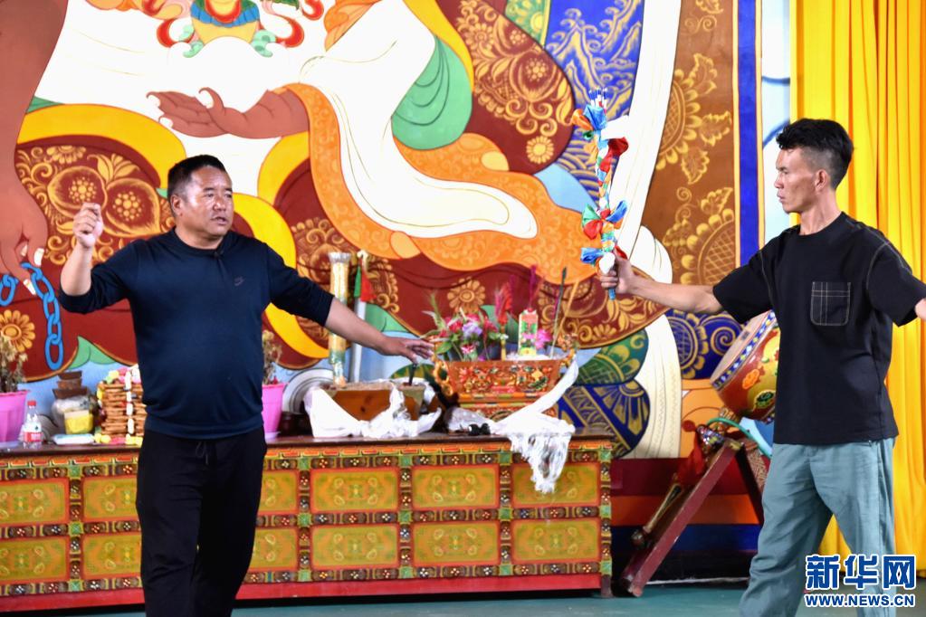 扎西曲登社區(qū)居委會主任尼瑪次仁(左一)指導(dǎo)年輕人排練藏戲(2021年7月15日攝)。新華社記者陳尚才 攝