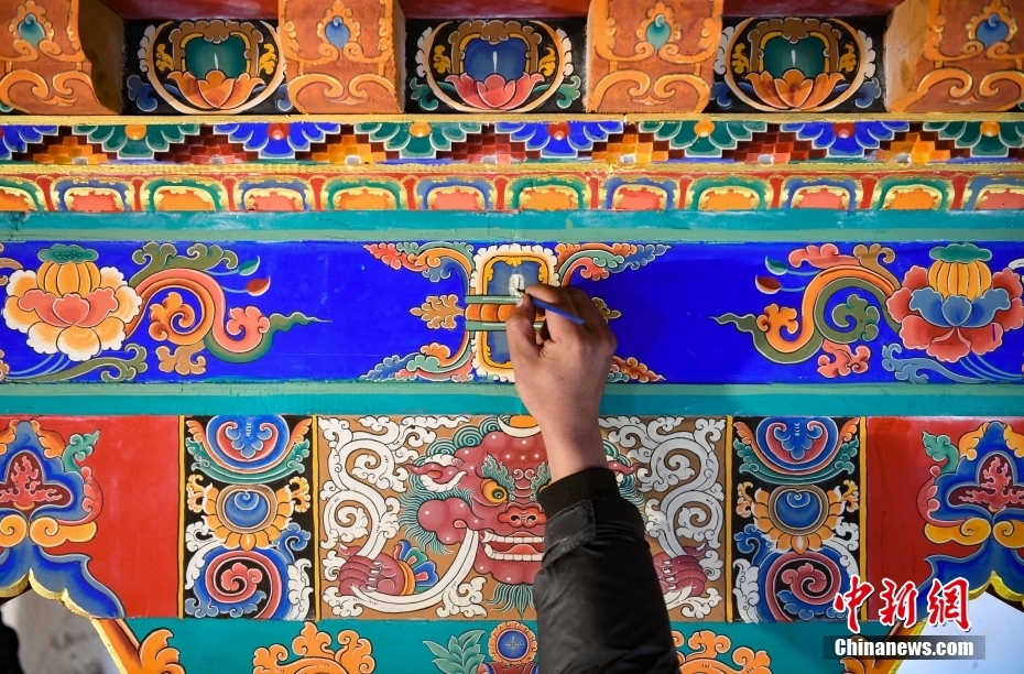 12月28日,西藏拉薩堆龍德慶區(qū),古俗民族傳統(tǒng)手工藝發(fā)展專業(yè)合作社員工在房屋上繪制藏式裝飾。據(jù)悉,該合作社以繪畫、木工、縫紉為主,承接傳統(tǒng)手工藝方式制作家具、房子裝修、唐卡繪畫、旅游產(chǎn)品、文物建筑維修等工作。自2018年合作社成立至今,帶動就業(yè)共60余人。 中新社記者 貢嘎來松 攝