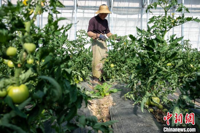 圖為28日,白朗中農(nóng)圣域農(nóng)牧科技有限公司工作人員在為大棚番茄授粉?!〗w波 攝
