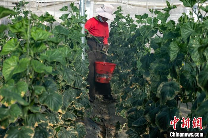 圖為農(nóng)牧民采摘黃瓜。 江飛波 攝