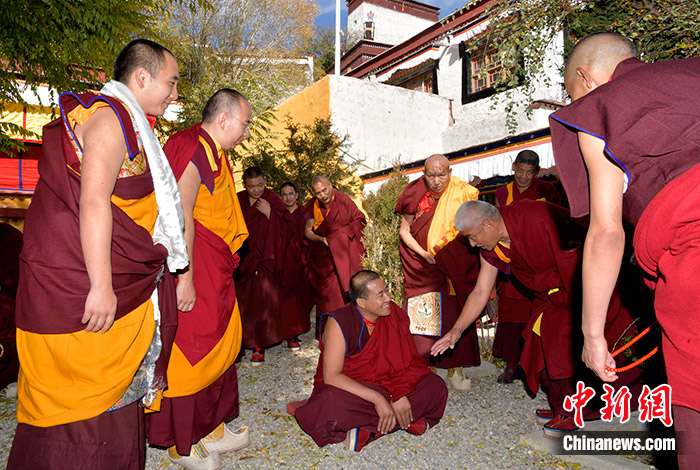 11月12日,班禪在扎西吉培寺辨經(jīng)場(chǎng)觀摩僧眾辨經(jīng)。當(dāng)日,班禪在西藏日喀則市謝通門縣扎西吉培寺禮佛。中新社記者 李林 攝