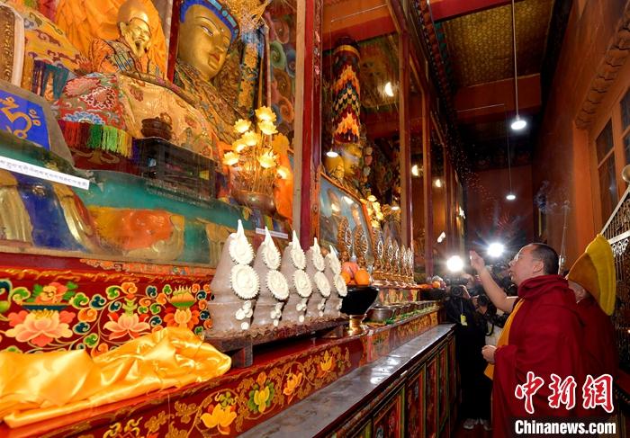 11月24日,班禪在白朗縣長(zhǎng)美堅(jiān)寺禮佛。中新社記者 李林 攝