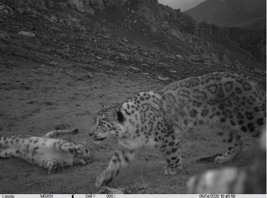2020年10月5日,在祁連山東麓的青海省互助北山國家級森林公園首次拍攝到的雪豹“母子同樂”影像畫面。(資料照)