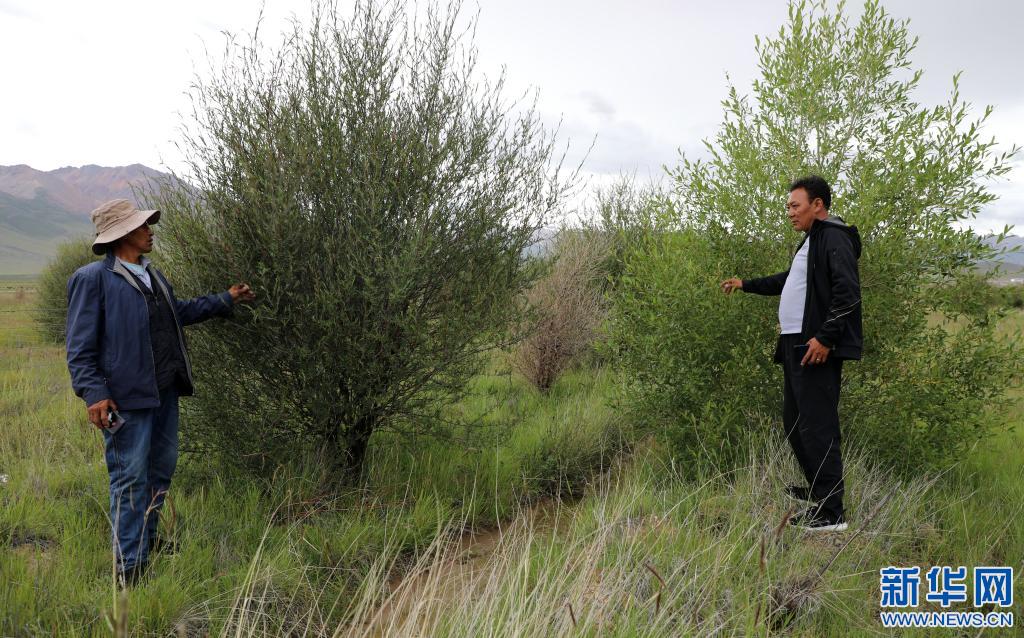 索朗羅布(右)在檢查樹的長勢(2020年8月8日攝)。新華社記者 覺果 攝