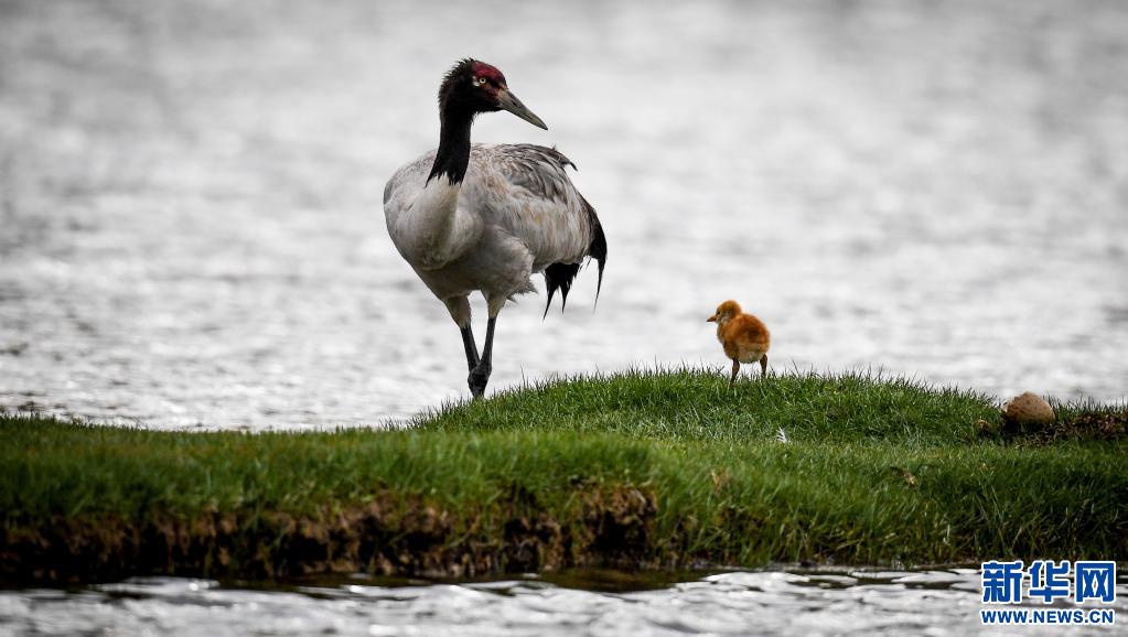 成年黑頸鶴帶著小黑頸鶴在藏北羌塘草原覓食。(新華社記者 普布扎西 攝)