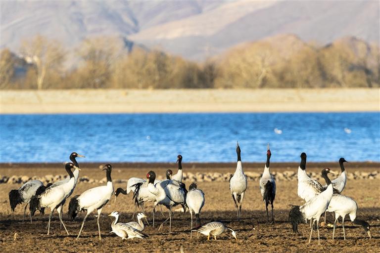 隨著西藏不斷加大黑頸鶴棲息地保護(hù)力度,黑頸鶴的生存環(huán)境進(jìn)一步改善。每年十月中下旬,大批黑頸鶴從藏北高原飛到拉薩河谷,它們?cè)谵r(nóng)田、沼澤地里覓食嬉戲,享受冬日暖陽。