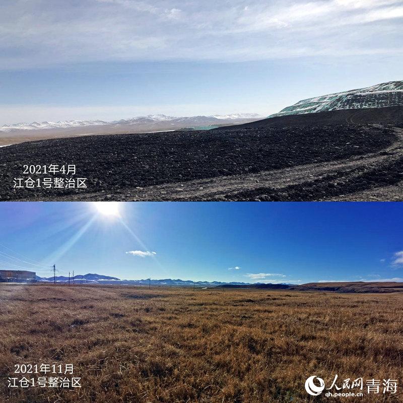 木里礦區(qū)江倉1號礦復(fù)綠前后對比。人民網(wǎng) 甘海瓊 攝