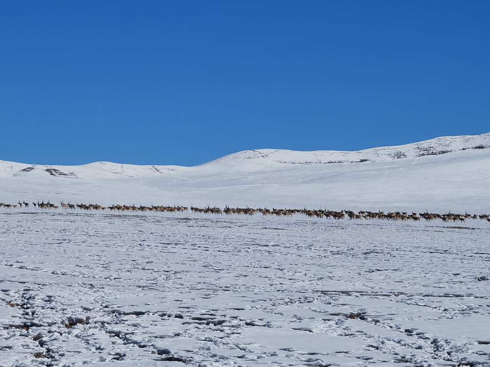 這讓仁增羅布的心揪了起來。之后幾天,他又跑了一次,就為了確認這些藏羚羊的生存情況。零下三四十度的天氣不變,草場厚厚的積雪沒有消退的意思,藏羚羊們的生存受到極端自然天氣的巨大威脅。