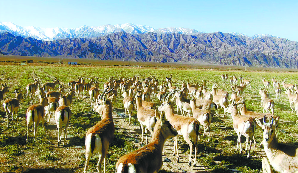 近日,200余只鵝喉羚集聚在海西蒙古族藏族自治州烏蘭縣呼德格勞牧場苜蓿草種植基地內(nèi),或悠閑吃草,或漫步在廣闊的牧野中,與背后的雪山構成一幅人與自然和諧共處的美麗畫卷。