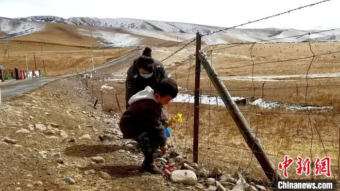 在青海省海北藏族自治州祁連縣青陽溝內(nèi),3歲的小扎西轉(zhuǎn)動(dòng)著手中的風(fēng)鈴,跟在母親忠可措身后開始一天的巡山。