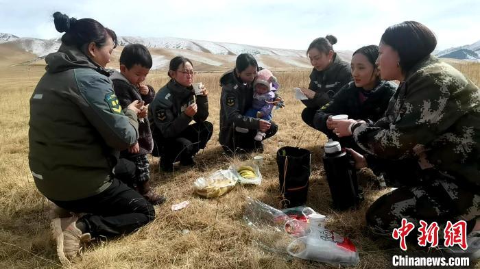在巡護(hù)了一大片林地后,大家聚到一起休息。草原上席地而坐,背著11個(gè)月大女兒的索南吉放下孩子,小扎西拿著風(fēng)鈴逗著妹妹。一壺清茶、一袋干糧、兩個(gè)孩子,一群女子交流著巡護(hù)情況,不時(shí)也會(huì)傳出開心的笑聲。