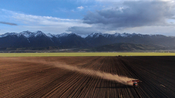 青海省三江集團(tuán)門(mén)源種馬場(chǎng)的工人駕駛農(nóng)機(jī)在油菜田里播種(無(wú)人機(jī)照片)。記者 張宏祥 攝