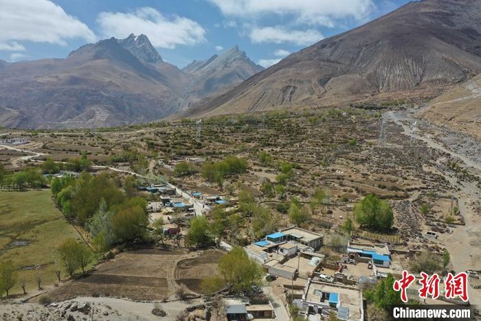 圖為4月12日,色麥村柳樹吐綠,春意濃濃。(無人機(jī)照片)。 中新社記者 貢嘎來松 攝