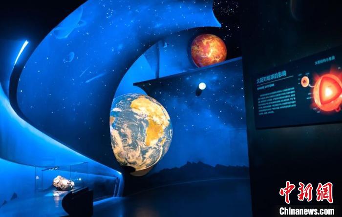 邁步進(jìn)入“地質(zhì)環(huán)境廳”,最最吸睛的,是一個(gè)巨大的、緩慢旋轉(zhuǎn)的“地球”,在深藍(lán)色的夜空背景下,地球上的紋理分毫畢現(xiàn)。頂層用微型燈組成的“星空”時(shí)不時(shí)有流星劃過,照亮了太陽系的其他行星。整個(gè)太陽系被高仿真還原,帶光環(huán)的土星、赤紅色的火星、體積最大的木星……