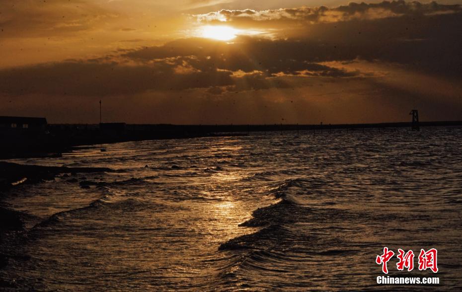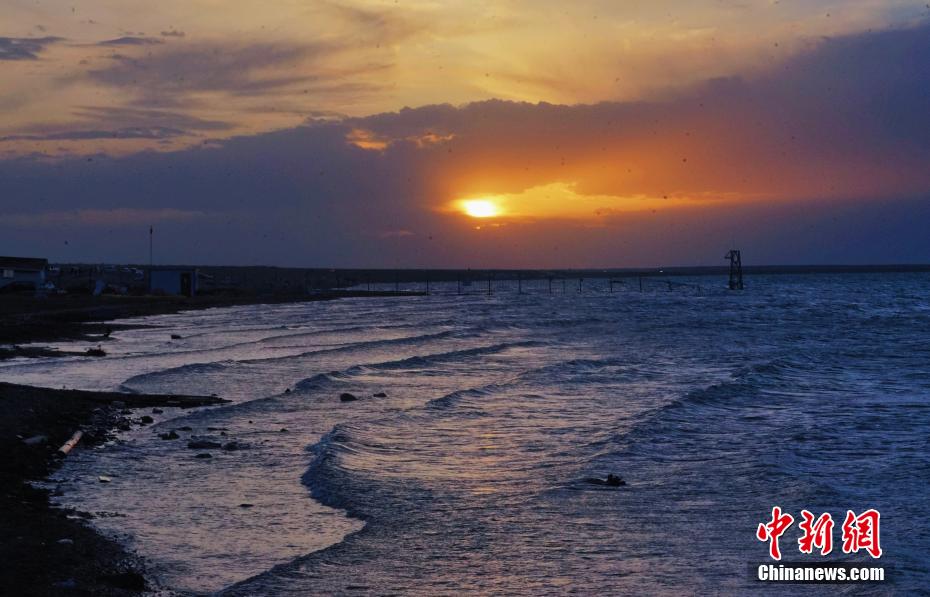 圖為夕陽(yáng)下的青海湖。