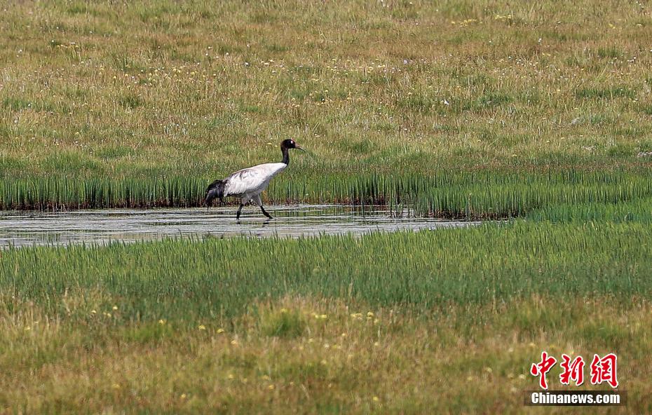 8月9日,祁連山南麓的青海省海北藏族自治州祁連縣央隆鄉(xiāng),三只黑頸鶴正在央隆濕地悠閑踱步,不時發(fā)出鳴叫聲。黑頸鶴是大型飛行涉禽,頸的上部為黑色,故稱黑頸鶴。每年,黑頸鶴在春季遷徙到繁殖地,秋季到達(dá)越冬地,是世界上唯一生長、繁殖在高原的鶴。圖為一只悠閑踱步的黑頸鶴。 賈天勇 攝