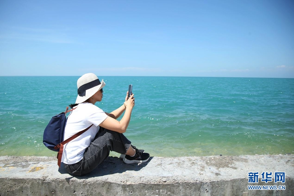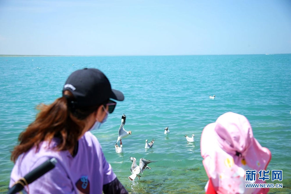 8月8日,游客在青海湖畔觀鳥(niǎo)賞魚(yú)。新華網(wǎng) 馬洪婷 攝