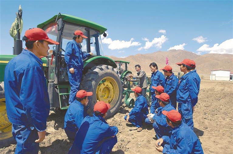 發(fā)展教育脫貧一批。2016年以來,累計(jì)落實(shí)義務(wù)教育學(xué)?;窘ㄔO(shè)資金84.4億元,實(shí)施教育基礎(chǔ)建設(shè)項(xiàng)目1433個(gè),資助建檔立卡和農(nóng)村低保大學(xué)生累計(jì)6.06萬(wàn)人次,落實(shí)資助資金3.55億元。圖為西藏自治區(qū)白朗縣邀請(qǐng)山東農(nóng)機(jī)技師對(duì)當(dāng)?shù)刎毨糸_展培訓(xùn)。