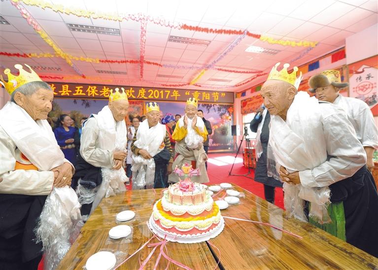 社會(huì)保障兜底一批。2021年,農(nóng)村居民最低生活保障標(biāo)準(zhǔn)達(dá)到5060元/年/人,城鎮(zhèn)居民最低生活保障標(biāo)準(zhǔn)達(dá)到10920元/年/人。圖為2017年10月28日,西藏自治區(qū)拉薩市達(dá)孜區(qū)特困人員集中供養(yǎng)服務(wù)中心為80歲老人們集體過生日。
