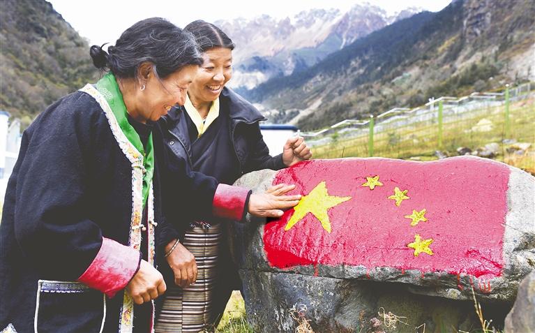 圖為“家是玉麥,國(guó)是中國(guó)”,人人爭(zhēng)做神圣國(guó)土守護(hù)者、幸福家園建設(shè)者。圖為“七一勛章”獲得者卓嘎和同為“時(shí)代楷模”的妹妹央宗抵邊巡邏。