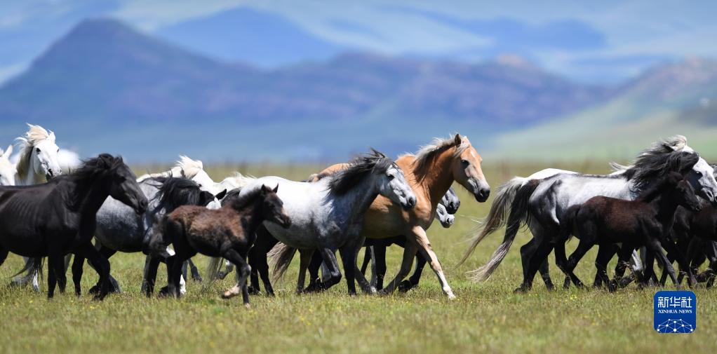 河曲馬在甘肅省甘南藏族自治州瑪曲縣河曲馬場的濕地奔跑(2019年6月22日攝)。新華社記者 陳斌 攝