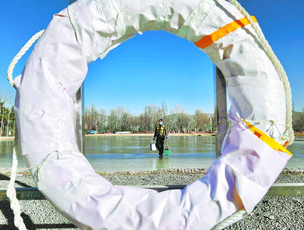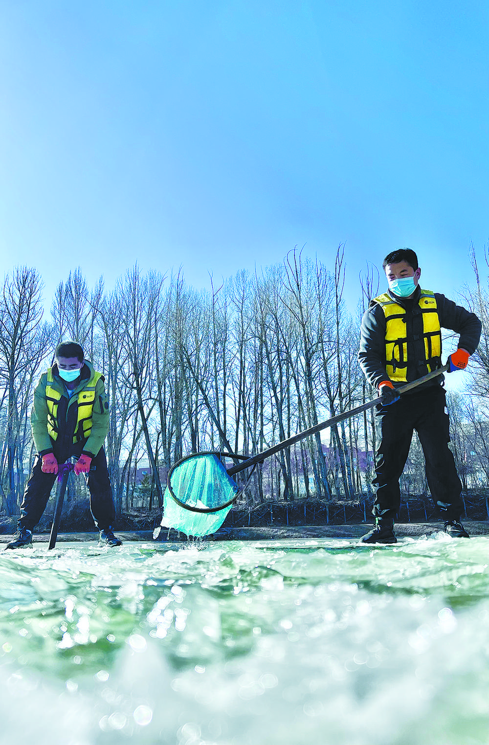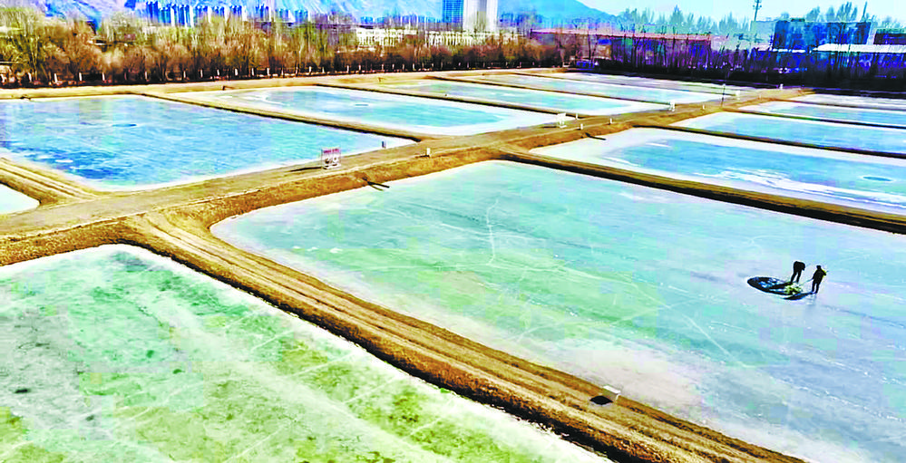 陽光透過冰面照射在18口冰封的魚塘里,為過冬的小魚苗增氧增溫。這片池塘是裸鯉來到裸鯉救護中心的第一站,田文根是這里的一名工作人員,主要負責室外原種場魚苗的培育和水質監(jiān)測工作。據他介紹,魚塘的水質決定著魚苗的健康狀況。在冬季,及時掃雪是一項非常重要的工作,因為冰層下面的裸鯉魚苗是靠浮游植物通過光合作用產生的氧氣生存,如果雪附著在冰層上,陽光無法透進,就容易造成缺氧。