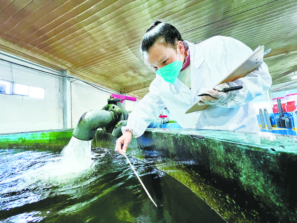技術人員記錄循環(huán)水養(yǎng)殖池的水體溫度。