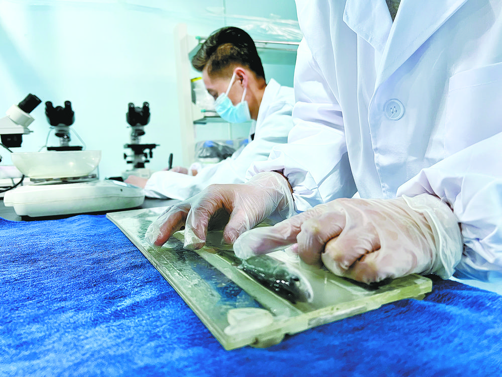 技術人員正在測量魚體的身長。